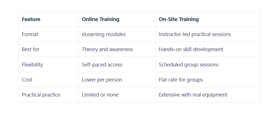 Online courses work well for annual refreshers when workers already have practical skills and just need to review principles. Theory components—understanding legislation, recognizing risk factors, knowing when to seek help—can be delivered effectively through eLearning. Organizations with teams spread across different locations might use online training for initial awareness, then follow up with local practical sessions.